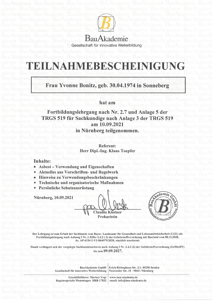 Das Arbeiten in kontaminierten Bereichen stellt hohe Anforderungen an die Qualifikation der ausführenden Mitarbeiter. Daher ist uns die regelmäßige Schulung und Weiterbildung unseres Personals nach den Vorgaben der Gefahrstoffverordnung sowie weiterer sicherheitsrelevanter Vorschriften ein wichtiges Anliegen.